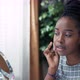 Removal makeup. Woman cleansing her face with a white cotton pad, looking at herself in the mirror. Influencer recording beauty tutorial skin care vlog using ring light phone for social media channel.
