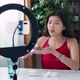 Removal makeup. Woman cleansing her face with a white cotton pad, looking at herself in the mirror. Influencer recording beauty tutorial skin care vlog using ring light phone for social media channel.