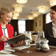 Cheerful young couple looking through menu at a posh restaurant