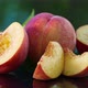 Ripe peaches and nectarine rotating on black surface with water drops or dew. Abstract organic backdrop. Juicy peach. Healthy eating, agriculture, farm, vitamins concept. High quality 4k footage