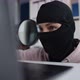 Robber wearing a mask and searching for information using magnifying glass on computer in office. Cybercrime and internet scammer concept