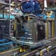 automation and robot operation in a technological factory. In the automatic production line, white goods are produced by robots.