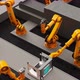 Industrial robots for factory automation. A Process of constructing 3d printers on an assembly line. Orange robotic arms programmed to pick and place parts of printers. Modern industrial technology.