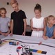 Robotics competitions. A group of children assembled robots from plastic parts in a robotics lesson and control them using the remote control.