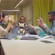 Diverse interracial team of robotics engineers gathered at office table, talking and brainstorming ideas of improvement robot during meeting in boardroom while developing cybernetic robot prototype.
