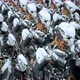 The camera flies past a squad of marching robot soldiers on a spaceship. Super realistic cinematic sci-fi animation