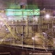 Drone view of Roller coaster attraction located in public amusement park with bright glowing lights at night time in city