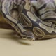Royal Python or Python regius on wooden snag in studio against a beige background. A snake with a spotted pattern crawling and looking at the camera. Scaly reptile twisted in a curl. Close up