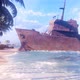 A ruined rusty ship lies on the beach of a tropical island. Concept of abandoned industrial vessels. Looping animation.