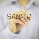 Man, Businessman, entrepreneur, stock trader, analyst or banker writes on transparent wall : Sample