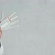 Scientist engineer is testing robotic prosthetic hand trying to move fingers, making gestures, side view.