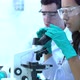 Scientist is looking through microscope with colleagues working in modern laboratory or medical center together. Concept of science, testing development and lab industry.