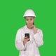 Medium shot. Scientist Using Phone Texting Message on a Green Screen, Chroma Key. Professional shot in 4K resolution. 013. You can use it e.g. in your commercial video, business, presentation, broadcast