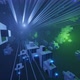 Fly through technology cyberspace with neon glow. Sci-fi flight through hi-tech technology tunnel. Hologram and neon light. 3d looped seamless 4k bg. sci-fi constructions, mysterious 3d objects in fog.