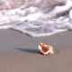 At sunset on the sea sand is seashell. Surf the wave with foam takes seashell into the sea. Close-up