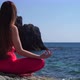 The woman in a red suit practicing yoga on stone at sunrise near the sea. Young beautiful girl in a red bathing suit sits on the seashore in lotus position. Yoga. Healthy lifestyle. Meditation