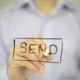 Man, Businessman, entrepreneur, stock trader, analyst or banker writes on transparent wall : Send