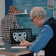 Senior remote man architect working on modern cad program analysing gears design. Industrial old engineer studying prototype idea on laptop computer showing cad software on device display