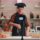 Experienced senior chef recording tutorial with food preparation in kitchen. Retired blogger influencer using internet technology communicating shooting blogging on social media with digital equipment