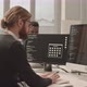 Handheld waist up slowmo shot of serious programmer with beard typing program code on computer sitting at modern open space office with colleagues
