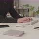 Tilting slowmo shot of serious male programmer of Caucasian ethnicity wearing headphones and eyeglasses working on computer at modern office