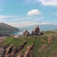 Sevanavank Monastery on Lake Sevan, Armenia. Flying around the Temple at sunny day. The temple on the mountain. High quality 4k footage
