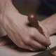 Sewing process. Unrecognizable male craftsman passing around pattern on canvas, preparing fabric for work, slow motion