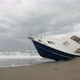Shoot during a stormy of the ocean of a blue and white little ship destroyed by the waves on the beach.