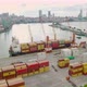 Batumi, Georgia – September 15, 2021: bird’s-eye view of a container ship carrying a container moored to the pier. in a cargo ship in an industrial port. Unloading of containers by a team and a crane.