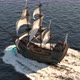 A medieval ship sailing on a vast blue sea. Concept of sea adventures in the Middle ages.