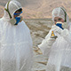 Two shocked scientists in protective coveralls and masks collecting samples in infected zone