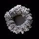 Round puffs of smoke with 3d render of diverging sound wave after powerful explosion. Epicenter of concentric rotation pulsation and geometric digital vibration.