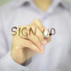 Man, Businessman, entrepreneur, freelancer, software engineer, programmer writes on transparent wall : Sign Up