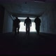 Silhouette of three production engineers working in the light. Employees of a construction company coming out of the underground parking lot on the street