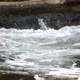 Slow motion closeup of a rushing stream, swift flow of spring water with some autumn colourful leaves in the water. Grey big stones, fallen autumnal leaves. Waterfall at fall. Nature’s landscape