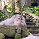Monkeypox. Male macaque lies lazily on a rock in the monkey forest and looks around. Fauna of the Indonesian island of Bali in Asia. Wild animal life