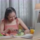 Smiling Asian Woman Learn To Cook Online With A Laptop And Enjoys Slicing The Cucumber At Home