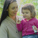 Mother and child on the lawn blowing soap sud