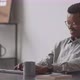 Waist-up stab shot of young African-American male programmer sitting at workplace in office in front of computer monitor, developing new software