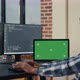 Software developer writing code using computer keyboard and laptop with green screen chroma key mockup sitting at desk. Programer looking at multiple screens with machine learning algorithm.