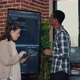 Software developers analyzing source code on wall screen tv comparing errors using digital tablet with focus switching to app developer writing algorithm. Team of coders working on computing big data.