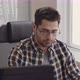Panning chest-up shot of two young multi-ethnic programmers sitting in front of computer monitors in modern office working on new software