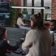 Software programer pointing pencil at source code on computer screen explaining algorithm to coworker standing next to desk. Programmers discussing online cloud computing with team.