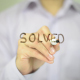 Man, Businessman, entrepreneur, stock trader, analyst or banker writes on transparent wall : Solved, Problem