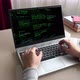Source code on the monitor screen. The girl working at home office hands on keyboard.