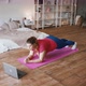 Sport training tutorial. Young overweight lady doing plank exercise, watching online fitness lessons on laptop at home