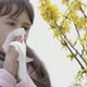 Spring allergy. The girl wipes nose with a handkerchief.