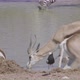 Close up shot of a male springbok drinking water at a waterhole while several other springboks walk around. There are some zebras in the background and a blacksmith lapwing bird on the foreground.
