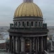 St. Isaac’s Cathedral St. Petersburg details facade close golden dome old sculptures angels of church decor. Cinematic sunset downtown beautiful cityscape. Central streets. Neva river. Aerial backward