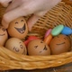 Stack of eggs with hand drawn faces on straw basket with colorful candy, easter preparation, holiday mood concepts, HD